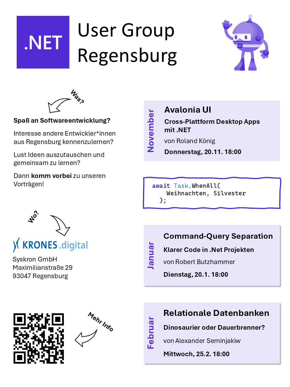 Wir sind die Dotnet User Group Regensburg. Wir wollen Programmierer*innen aus Regensburg zusammenbringen, Ideen austauschen und gemeinsam lernen.