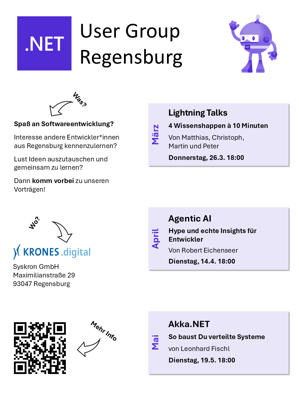 Wir sind die Dotnet User Group Regensburg. Wir wollen Programmierer*innen aus Regensburg zusammenbringen, Ideen austauschen und gemeinsam lernen.